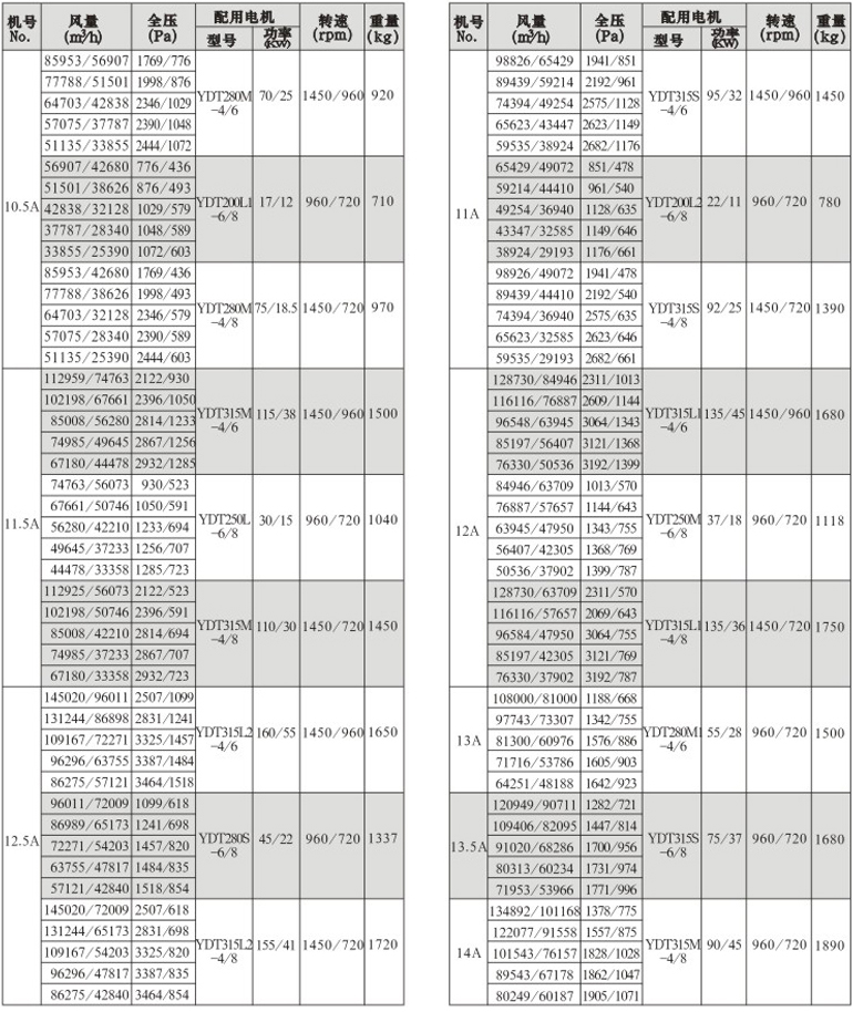 PYHL-14A系列双速混流排烟风机性能参数表(1)