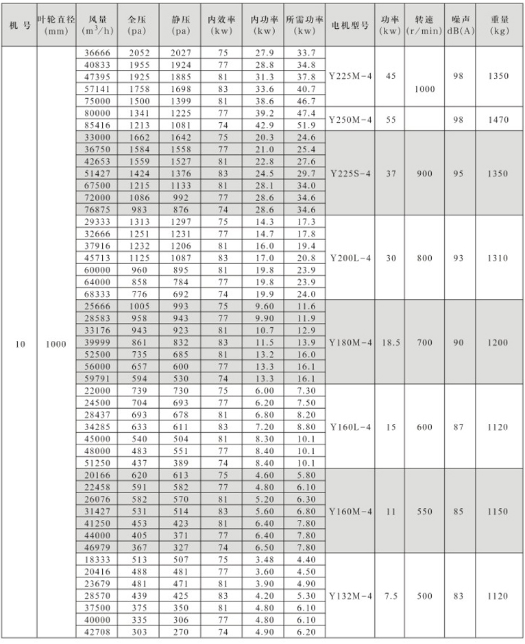 风机按直径分为250~1600mm十七种规格,系列风量为1000~300000m3/h,全压为280~2300Pa。风机分单速和双速,双速风机配用双速电机,实现两档调速,可满足用户对不同工况点性能调节的需要,风机也可配用变频电机和变频控制器,实现变频调速,建议调节频率锁定在25Hz~50Hz。