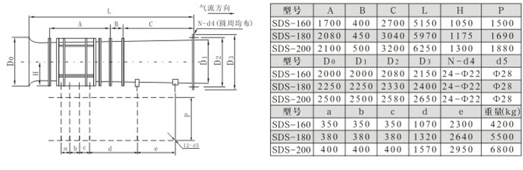 SDS-160~200型动叶可调隧道单级轴流通风机外形尺寸表(右)