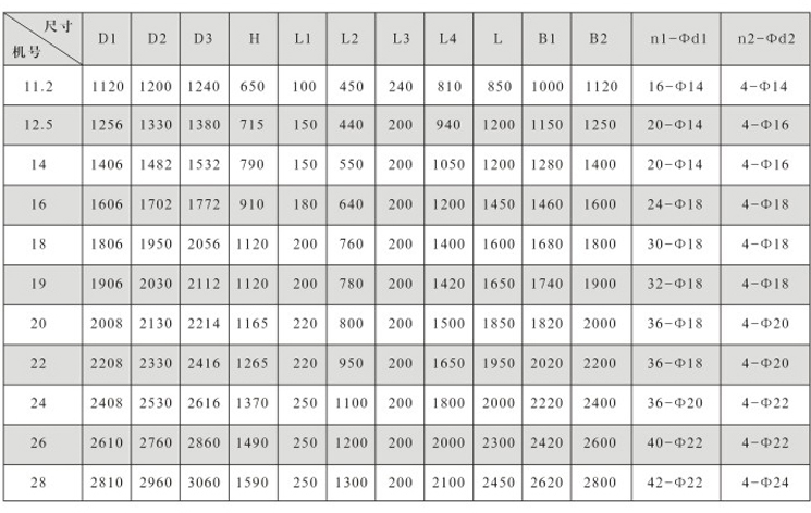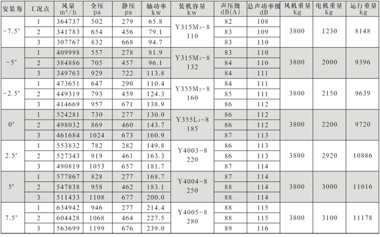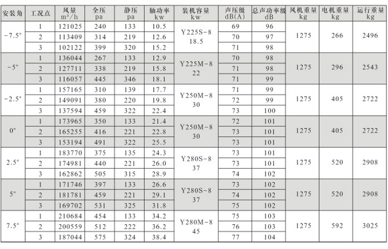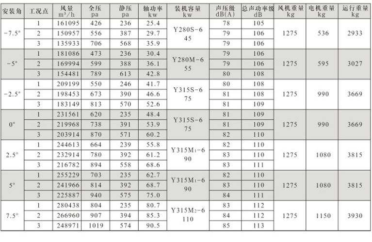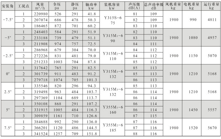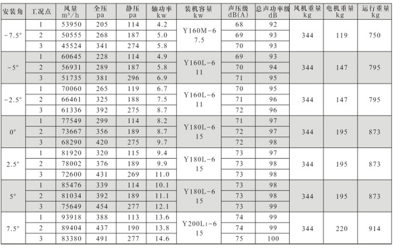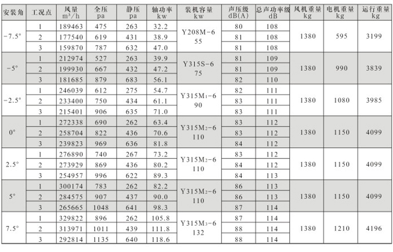 风机叶轮:有轮毂、叶片组成,其风机叶片分固定、动调、静调三种方式、静调或动调叶片可在-7.5°~7.5°范围内调节,动调风机又分为气压式和电动式二种,可在连续运行状态下调节叶片角度。