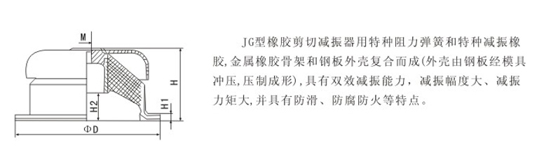 JG型橡胶剪切减振器用特种阻力弹簧和特种减振橡胶,金属橡胶骨架和钢板外壳复合而成(外壳由钢板经模具冲压,压制成形),具有双效减振能力,减振幅度大、减振力矩大,并具有防滑、防腐防火等特点。