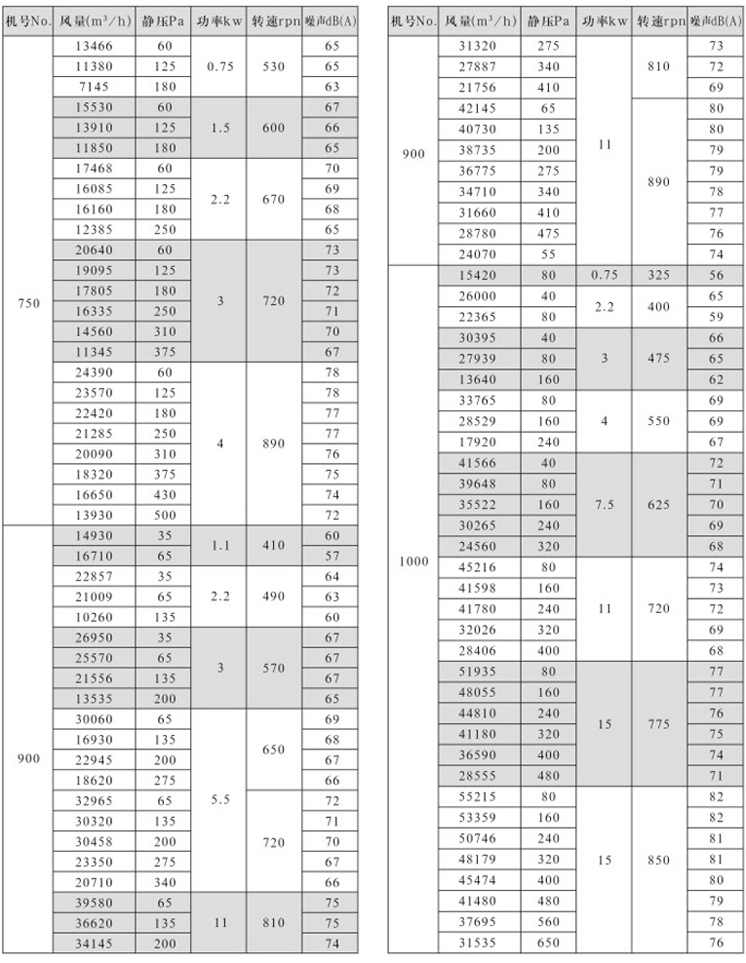 本系列风机叶轮、电机机号按叶轮直径分有300、425、500、575、675、750、900、1000,共8种规格,风量自1275m3/h至55215m3/h,最高静压达650Pa。