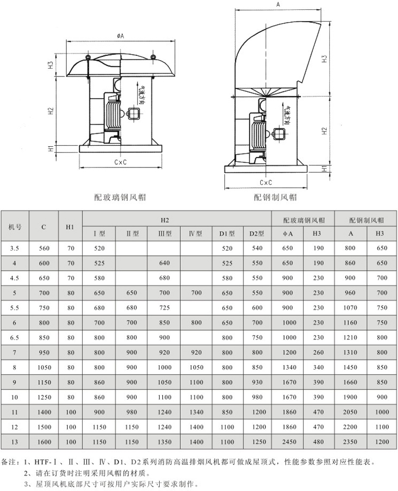 HTF-W屋顶式消防高温排烟混流式通风机外形及安装尺寸