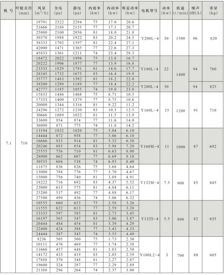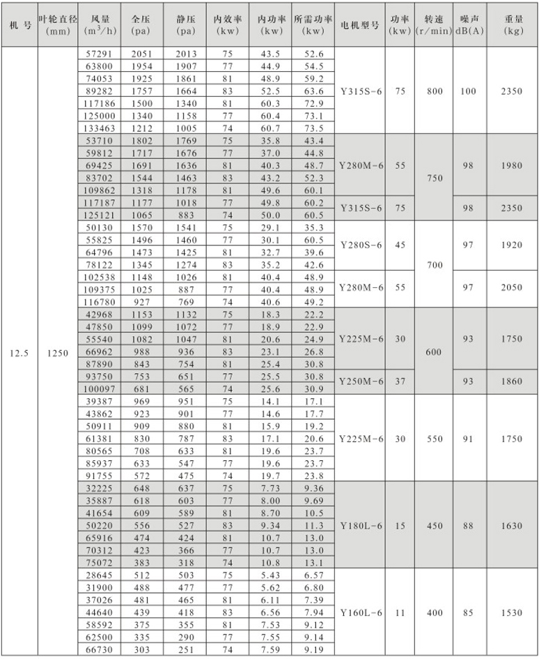风机按直径分为250~1600mm十七种规格,系列风量为1000~300000m3/h,全压为280~2300Pa。风机分单速和双速,双速风机配用双速电机,实现两档调速,可满足用户对不同工况点性能调节的需要,风机也可配用变频电机和变频控制器,实现变频调速,建议调节频率锁定在25Hz~50Hz。