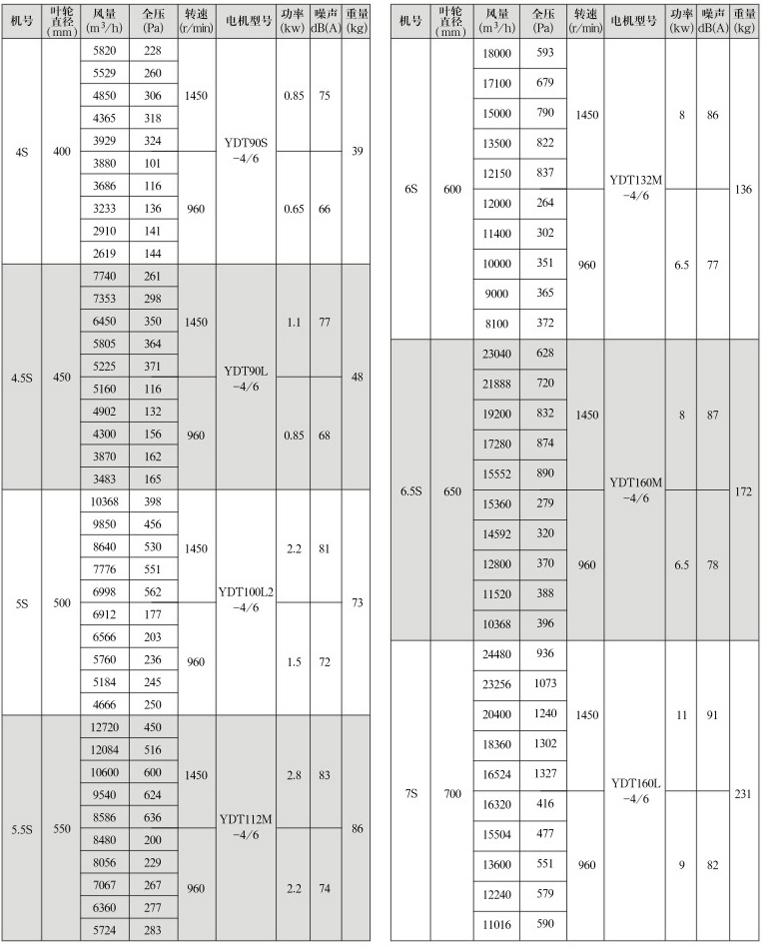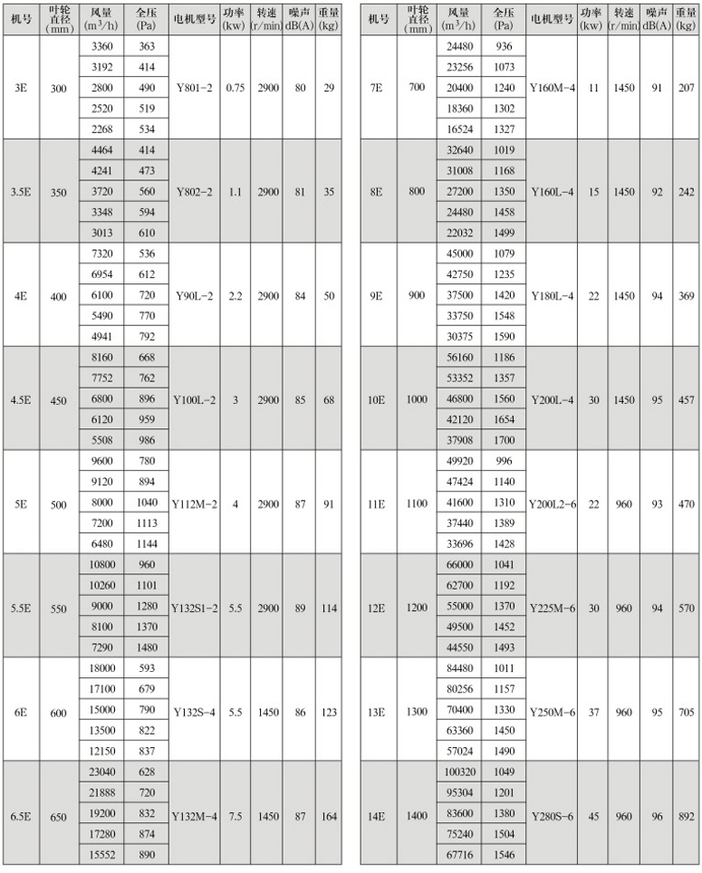 GXF系列斜流通风机按叶轮直径分为300-1400mm十六种规格,按类型分A、B、C、D、E、F、S七种类型,共五十八个机号。风量由1500mm-90000m3/h,全压由185-2500Pa;这样就给设计部门和也难怪乎单位提供了充分的选择条件,具体数据参照风机性能参数表。