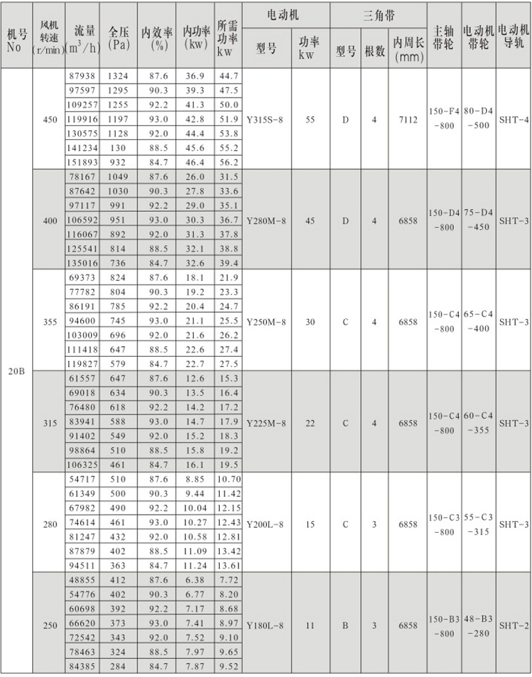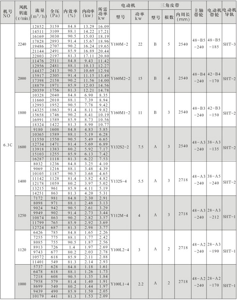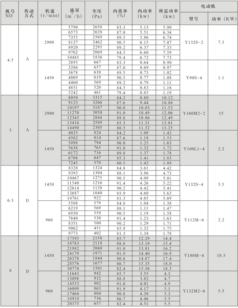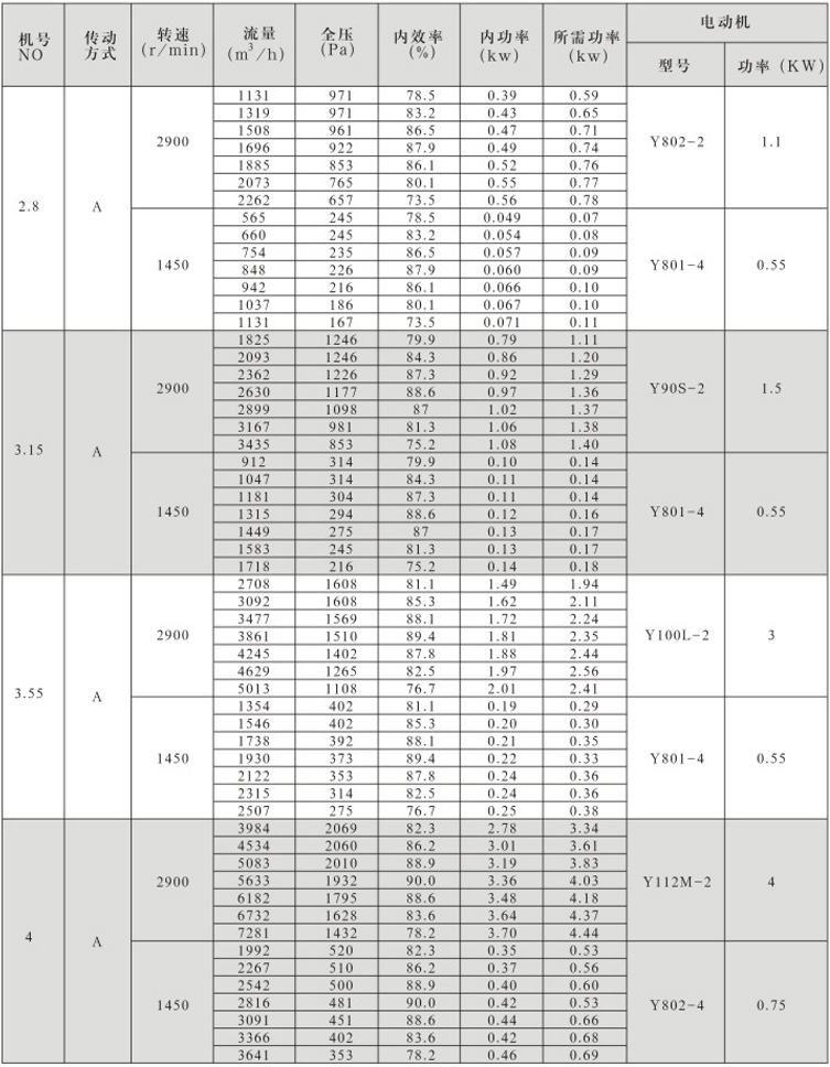 1)叶轮由12个后倾翼型叶片、曲线型前盘和平板后盘组成。均用钢板制造,并经动、静平衡校正,空气性能良好,效率高、运行平稳。