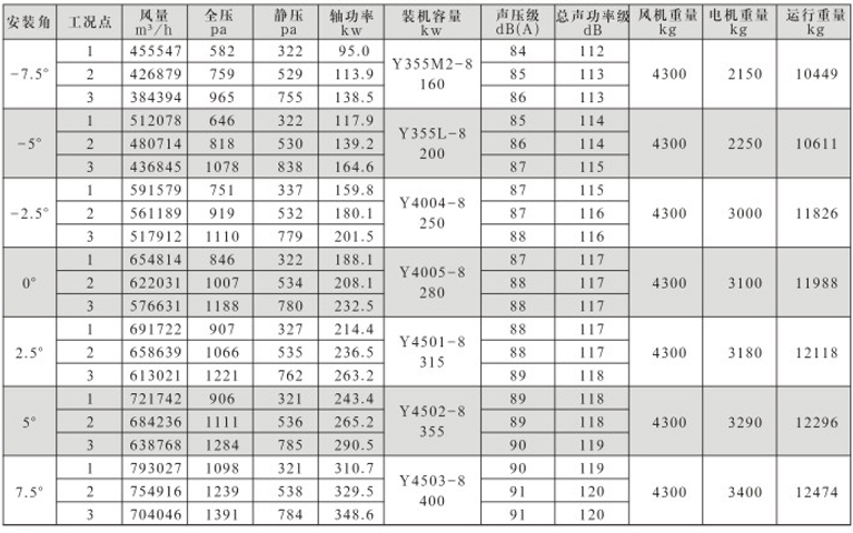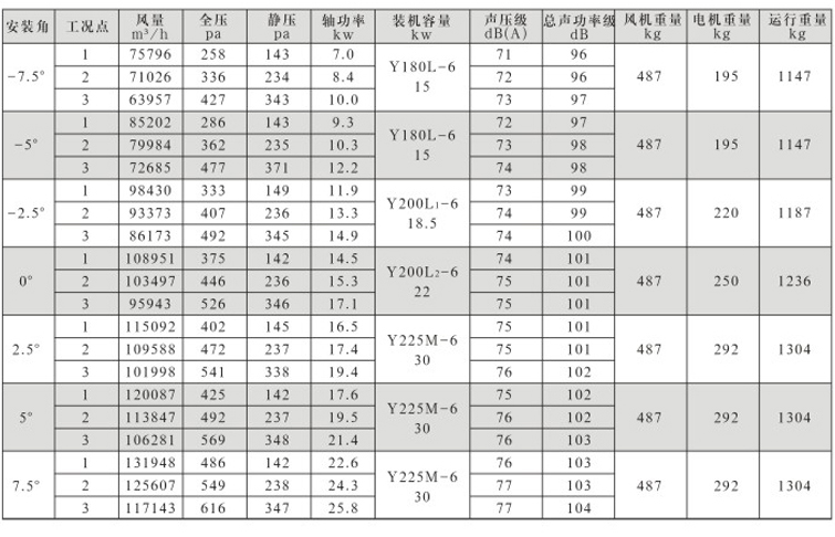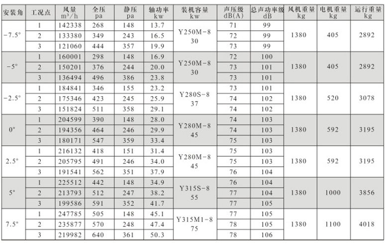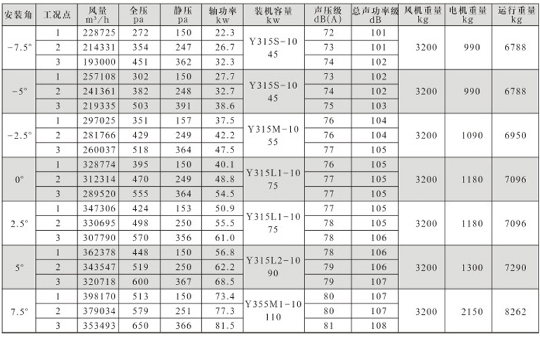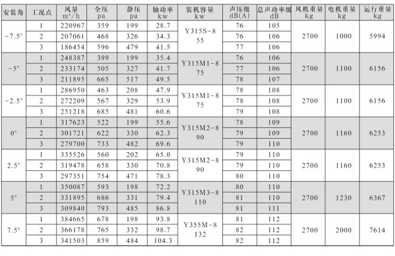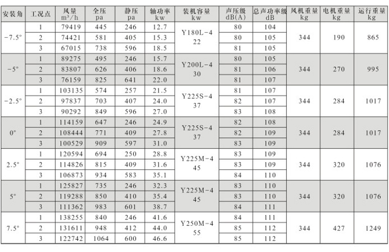 风机叶轮:有轮毂、叶片组成,其风机叶片分固定、动调、静调三种方式、静调或动调叶片可在-7.5°~7.5°范围内调节,动调风机又分为气压式和电动式二种,可在连续运行状态下调节叶片角度。